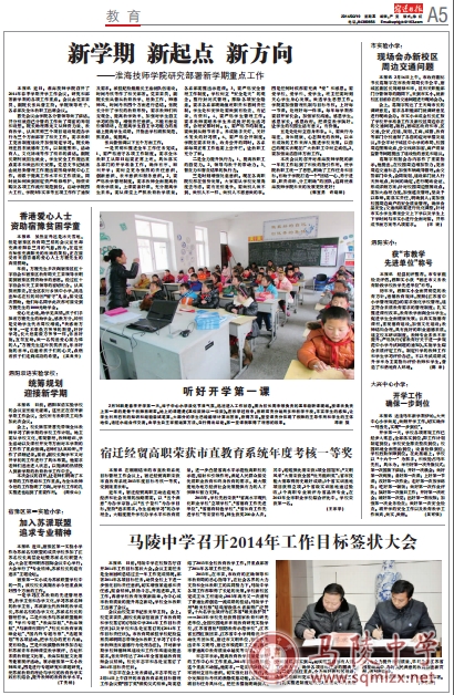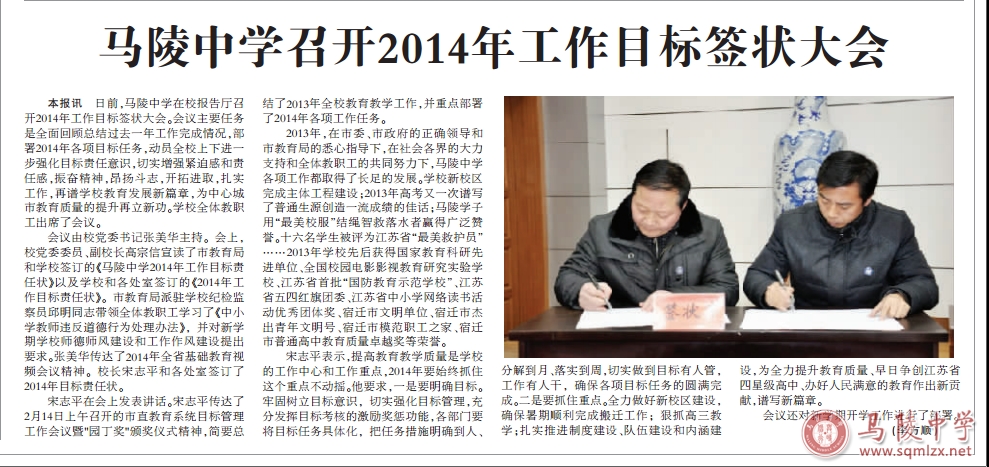 2014年2月14日下午,马陵中学在学校报告厅召开2014年工作目标签状大会。会议主要任务是全面回顾总结过去一年工作完成情况,安排部署2014年各项目标任务,动员全校上下进一步强化目标责任意识,切实增强紧迫感和责任感,振奋精神,昂扬斗志,开拓进取,扎实工作,再谱学校教育发展新篇章,为中心城市教育质量提升再立新功。学校全体教职工出席了会议。