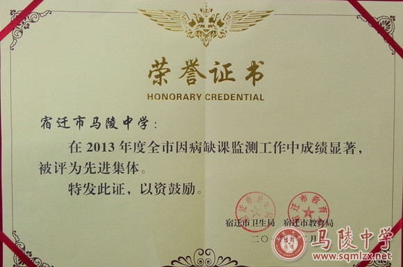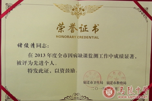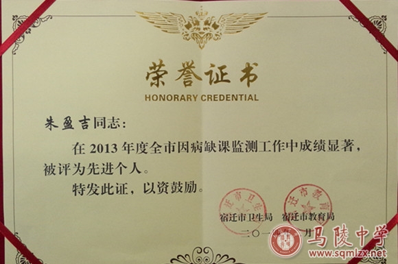 我校被市教育局、市卫生局评为2013年度因病缺课监测上报工作先进集体,朱盈吉老师被评为先进个人。
