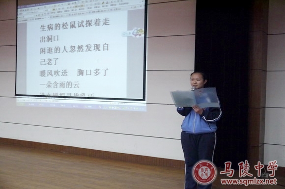 我校一直倡导和贯彻老校长沈薪萍提出的“爱自己,爱他人,爱社会”的“三爱”教育主张,如今“三爱”已经成为“马陵精神” 的核心和灵魂。也因此百年的钟吾书院在新的时期,就诞生了”最美校服”和“最美救护员”,并为媒体广为传播。让学生接受诗歌的熏染和陶冶,正是培养学生热爱自然、热爱社会和热爱他人的一种美好的方式。高一年级主任盛莉、语文教研组组长刘扬和高一语文备课组组长王军到现场观看了演出。