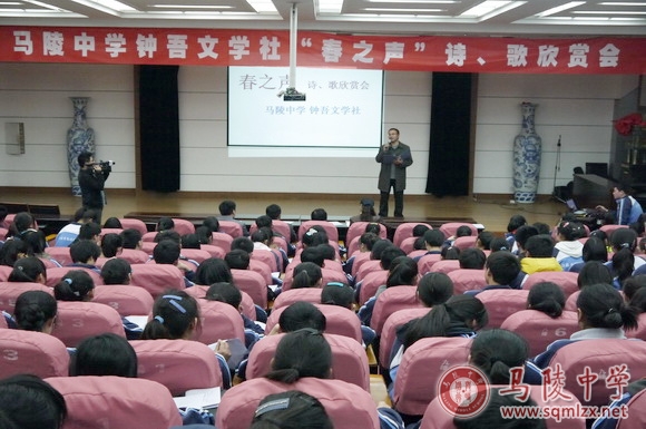 桃红柳绿,春光明媚。4月1日晚,我校报告厅一场精彩的诗、歌欣赏会正在上演。有精美的当代诗歌的朗诵,有优美的“中国好歌曲”的呈现,有校园十佳歌手的倾情演绎,大家时而沉静于纯美的诗歌,时而激昂于动听的歌曲,钟吾文学社的同学们度过了一个难忘的夜晚。