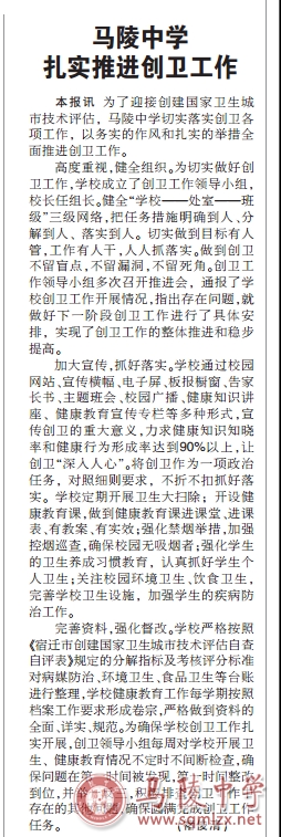 为了迎接创建国家卫生城市技术评估,马陵中学切实落实创卫各项工作,以务实的作风和扎实的举措全面推进创卫工作。