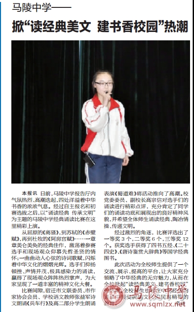 日前马陵中学报告厅内气氛热烈、高潮迭起,四处洋溢着中华书香的浓浓气息。经过自主报名和初赛选拔之后,以“诵读经典 传承文明”为主题的马陵中学经典诵读比赛在这里精彩上演。