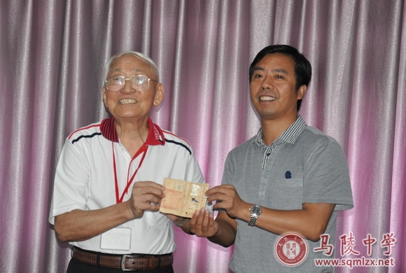 谈起学生时代的风华正茂,长居台湾的老校友台北宿迁同乡会会长张守礼先生按耐不住激动,此次来大陆他带了很多珍贵的礼物送给母校,其中一张1948年宿迁县立初级中学毕业证的原件让老人感慨万分:“我们到台湾那天下大雨,穿着学生装所有的物品都打湿了,这一张毕业证书是最珍贵的代表我是马陵中学前身宿迁县立中学的学生,验明我们正身了,把他拿到母校来,我就是马陵中学的校友。”不光毕业证书保存完好,另一张1946年引发的的学生证和当时大家参加歌唱团的照片也是奇迹般的珍藏下来。