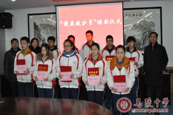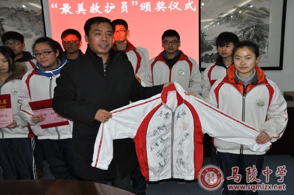 仪式最后宋校长对获奖的16名同学表达了衷心的祝贺和深切的期望。宋校长说:“我们马陵中学的学生在危难之际,能够用自己的智慧和勇敢加入到救护他人的行动中,弘扬了这个时代的真善美,你们的事迹传遍了这个城市,得到了人们的赞扬、媒体的宣传。希望同学们在今后的学习生活中发扬这种精神,感染带动身边更多的人,营造一个文明、健康、向上的社会风貌,让这股体现真善美的正能量传递的更远,更广”。