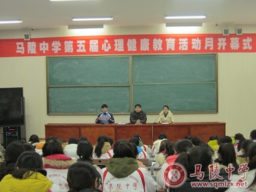 2014年12月9日下午4:40,马陵中学第五届心理健康教育月开幕式在阶梯教室举行。分管政工的副校长褚俊清、政教处副主任袁艳红出席了开幕式。来自三个年级的三百余名学生代表参加了开幕式。开幕式由袁艳红主持。