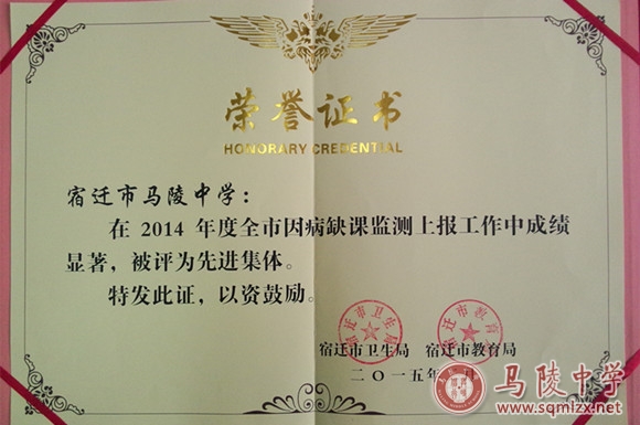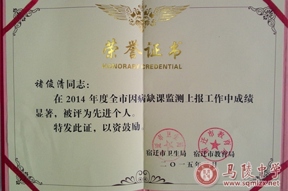 在2014年度全市因病缺课监测上报工作中,我校被评为先进集体。褚俊清副校长、朱盈吉老师被评为先进个人。