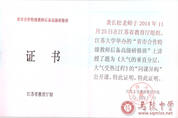 我校教师龚长松于2014年11月25日在江苏省教育厅组织、江苏大学举办的“省市合作特级教师后备高级研修班”上讲授了题为《大气的垂直分层、大气受热过程》的“同课异构”公开课。