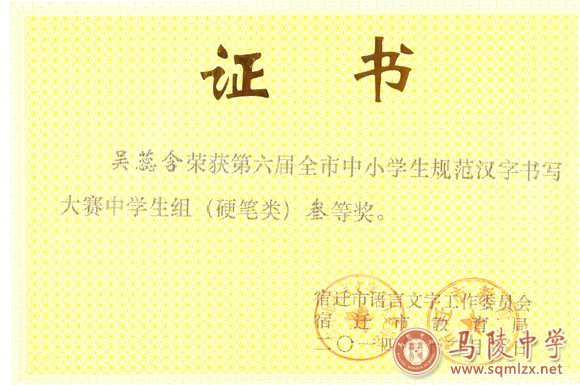 我校学生吴蕊含荣获第六届全市中小学生规范汉字书法大赛中学生组(硬笔类)三等奖。
