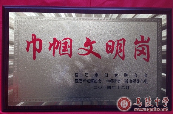 2015年3月26日从市教育局传来喜讯,根据宿迁市妇女联合会、宿迁市城镇妇女“巾帼建功”活动领导小组文件《关于命名2014年度市级“巾帼文明岗”的决定》(宿妇协﹝2014﹞5号)精神,确认我校获得“宿迁市巾帼文明岗”荣誉称号。2014年我校女性教职工为学校管理、教育教学、新校区建设等做出了重要贡献。面对荣誉,2015年女同胞们将再接再厉,再创佳绩。