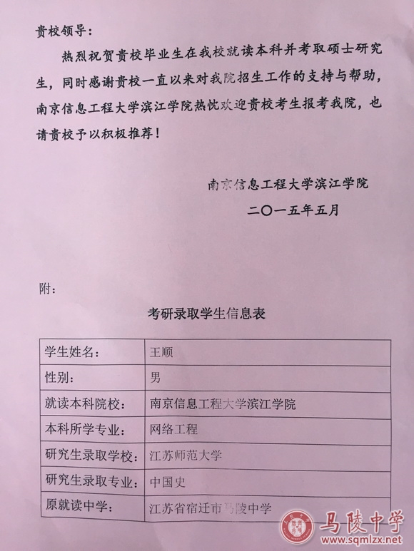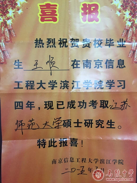 热烈祝贺我校2011届毕业生王顺考取江苏师范大学硕士研究生!