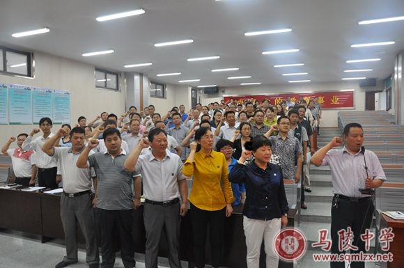 全体党员重温入党誓词,激励全体党员要时刻牢记“为人民服务”党的崇高宗旨;时刻保持党的优秀传统和作风;时刻牢记入党誓词,坚定信仰,爱岗敬业;争当优秀共产党员,时刻发挥先锋模范作用,适应新形势,展示新作为,为马陵中学不断实现新跨越而努力奋斗。