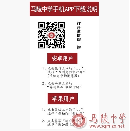 欢迎广大师生扫描“马陵中学”手机APP自媒体平台二维码,并踊跃分享朋友圈,保存到手机桌面,随时“轻松、快捷”关注马陵、宣传马陵。