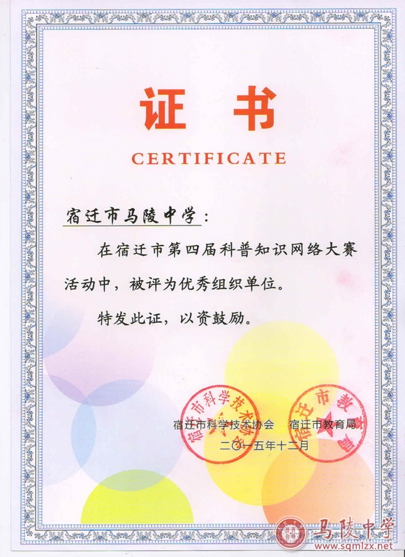 日前,宿迁市第四届科普知识网络大赛结果公布,我校荣获此次活动优秀组织奖,电教中心教师金伟芳荣获“优秀指导教师”称号,12名学生获个人奖,获奖数量全市领先。