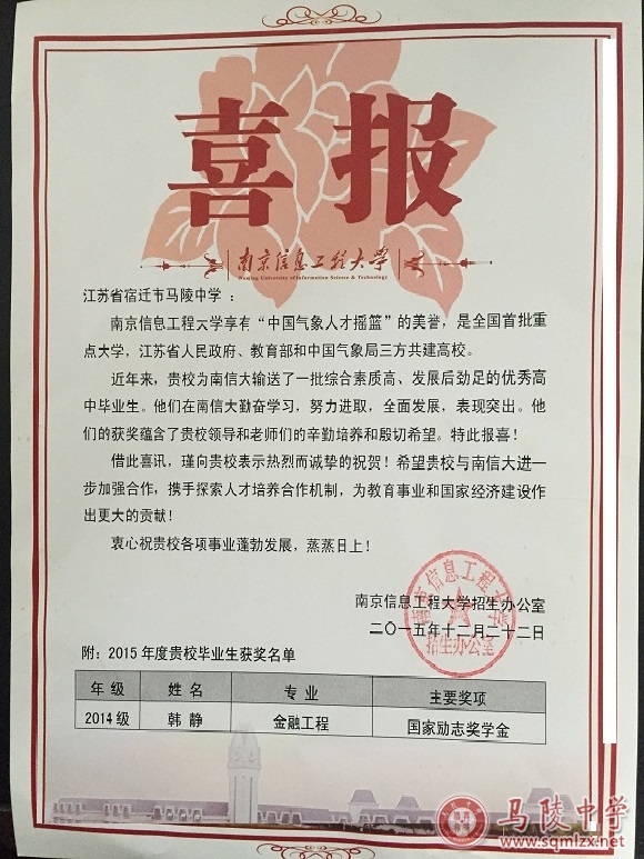 我校2014届毕业生韩静同学荣获“国家励志奖学金”。