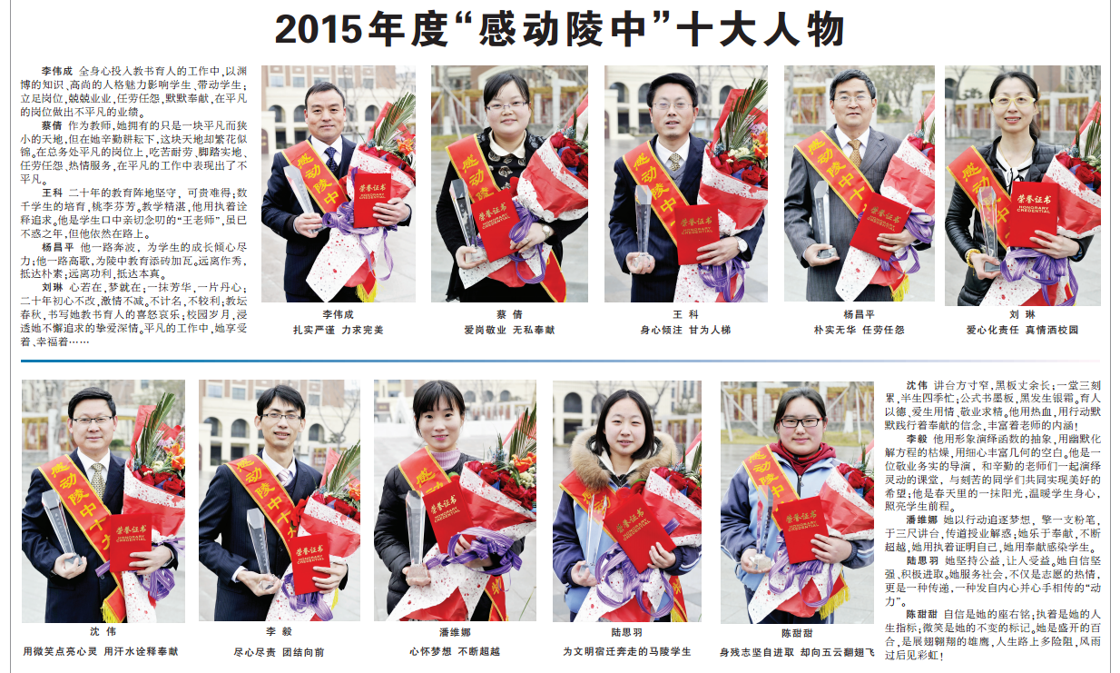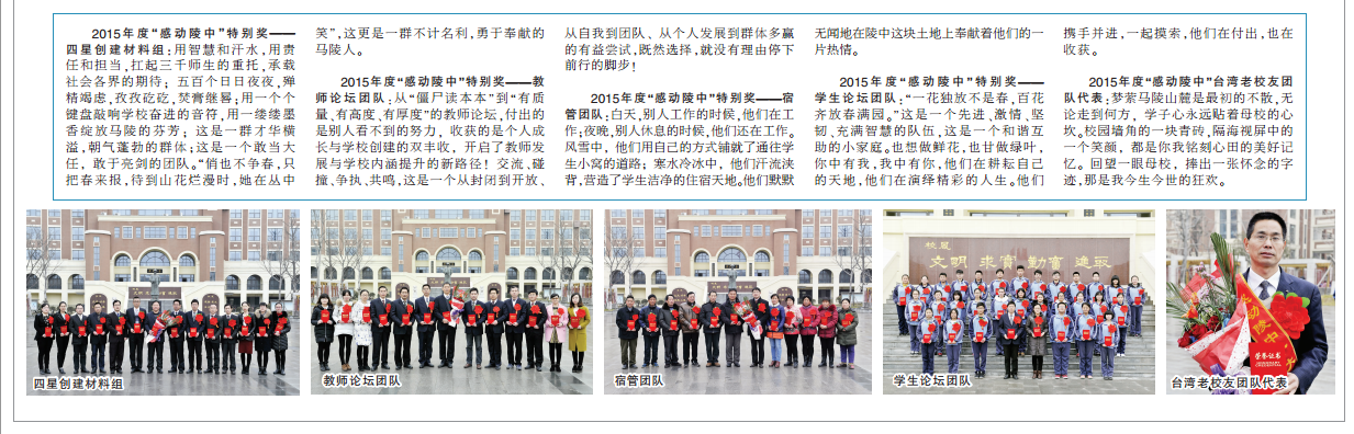2月20日下午,在马陵中学举行的2015年度“感动陵中”人物评选活动上,十位感动陵中人物、五个感动陵中特别奖,让陵中的新学期伊始,温暖如春。