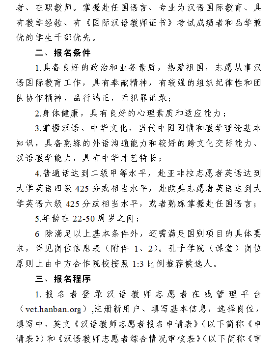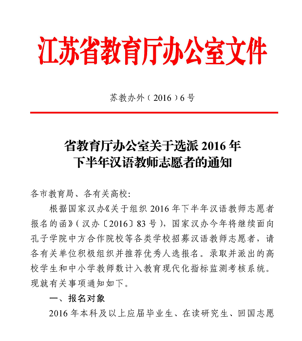 近期,省教育厅办公室下发《关于选派2016年下半年汉语教师志愿者的通知》(苏教办外〔2016〕6号),对2016年下半年汉语教师志愿者报名工作进行专题部署。现将文件转发给你们,请符合条件的教师自愿报名, 3月9日上午前,报名下半年孔子学院志愿者及部分签证周期较长的志愿者将材料报送至校办李方顺主任处,其他岗位志愿者材料请于3月22日前报送。逾期不再受理。