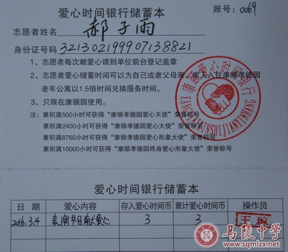 活动结束后,每位同学都办理了一张《爱心时间银行储蓄本》,详细记录了本次志愿服务的时间。“时间银行”储蓄的是行善记录,支取的是“善有善报”。作为江苏首家“时间银行”,康颐孝德园“时间银行”于2016年1月正式开张,该“银行”是借鉴外国志愿服务组织的先进做法创办。简单地说,就是一个人做了义工,所付出的时间就会被义工组织记录下来,有朝一日若需要就可以凭借“时间银行”的储蓄,优先获得同等时间的义工服务。