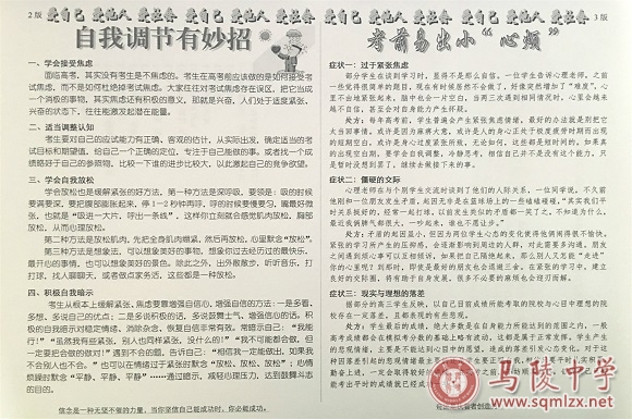 高考临近,为帮助高三学生调适自身心态、缓解考试焦虑、增加自信心,我校心理健康教育中心特编辑本期“高考专题”心理小报,指导高三学生调整心态,积极迎考。