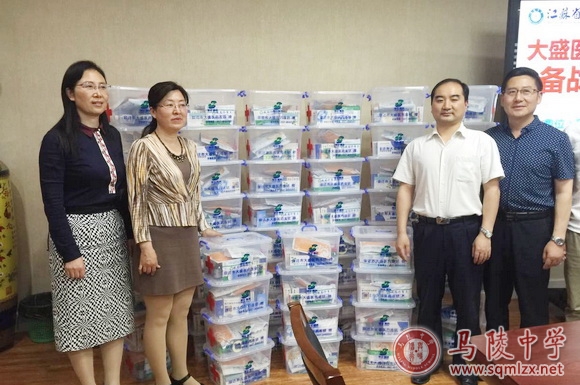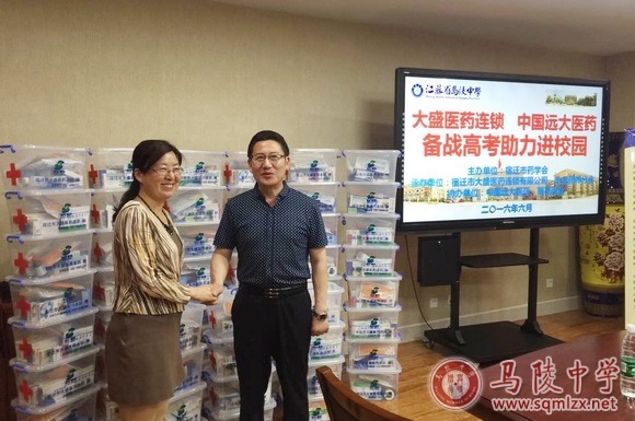 6月3日下午,在宿迁市食品药品安监局安全总监章厚知带领下,宿迁市药学会理事长、宿迁市大盛医药连锁有限公司总经理陈通和远大药业中国有限公司华东大区总监张全喜一行来到我校,开展主题为“备战高考,助力进校园”的公益活动。活动由我校分管高三年级的副校长张宇主持。