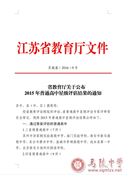2016年6月29日,江苏省教育厅正式发文:马陵中学晋升为江苏省四星级普通高中。