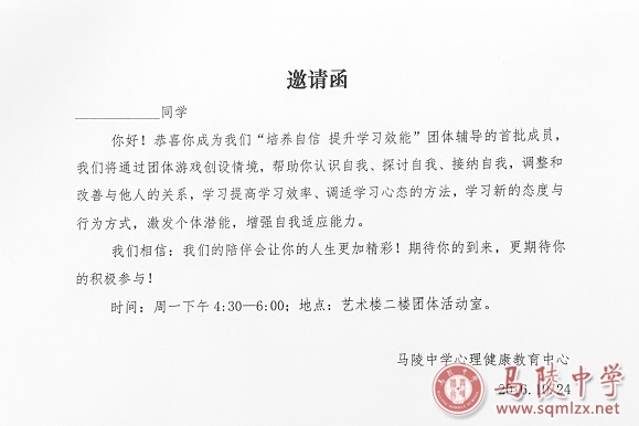 此次“培养自信 提升学习效能”系列团体辅导为高一心理普查后续活动,共设置4个单元主题训练,旨在帮助学生通过团体情境下的成员互动,提高学习效率,调适学习心态,学习新的态度与行为方式,激发个体潜能,增强自我适应能力。