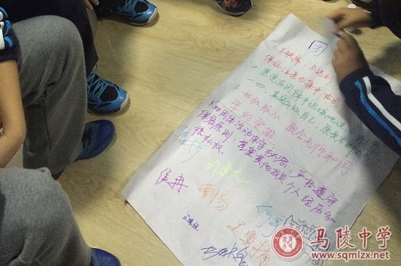 两轮游戏结束后,小组内的气氛不再生涩。接着,沈老师带着学生一起制定团体契约,明确团辅活动的要求,大家一一认可并签字确认。随后,学生们讨论、确定小组组名,绘制小组海报,一言一语间已然相处自如,全身心投入其中。活动在海报展示中落下帷幕。