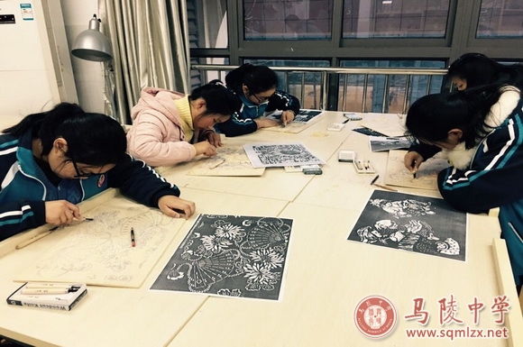 本节课的活动内容主要是版画的刻制过程。同学们准时到达美术教室,上一节课大家基本都已完成版画草图的复制,本次课开始根据图案内容用刻刀进行雕刻。