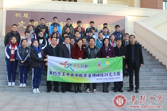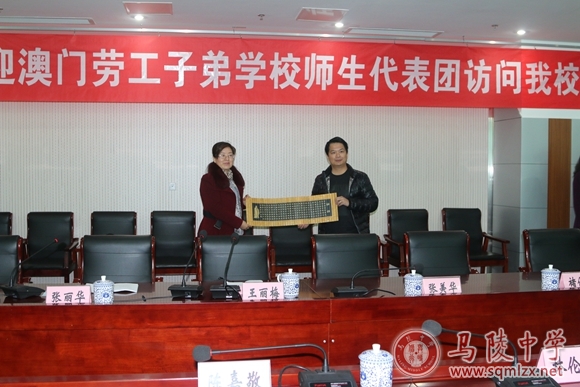 在欢迎会上,校长王丽梅代表全校师生向他们致以诚挚的问候与欢迎,并详细介绍了学校办学历史,办学宗旨、校园文化、办学成果等情况。通过观看视频,澳门劳工子弟学校副校长林伦伟称其校“爱祖国、爱澳门、爱学校”的“三爱”教育与我校“爱自己、爱他人、爱社会”的“三爱”教育有异曲同工之妙。他表示,此行前,便已通过网络等方式对马陵中学有了一定的了解,并且对学生也做了相关培训。他希望此次来访,能将学校优秀的组织管理经验、校园文化带回澳门。