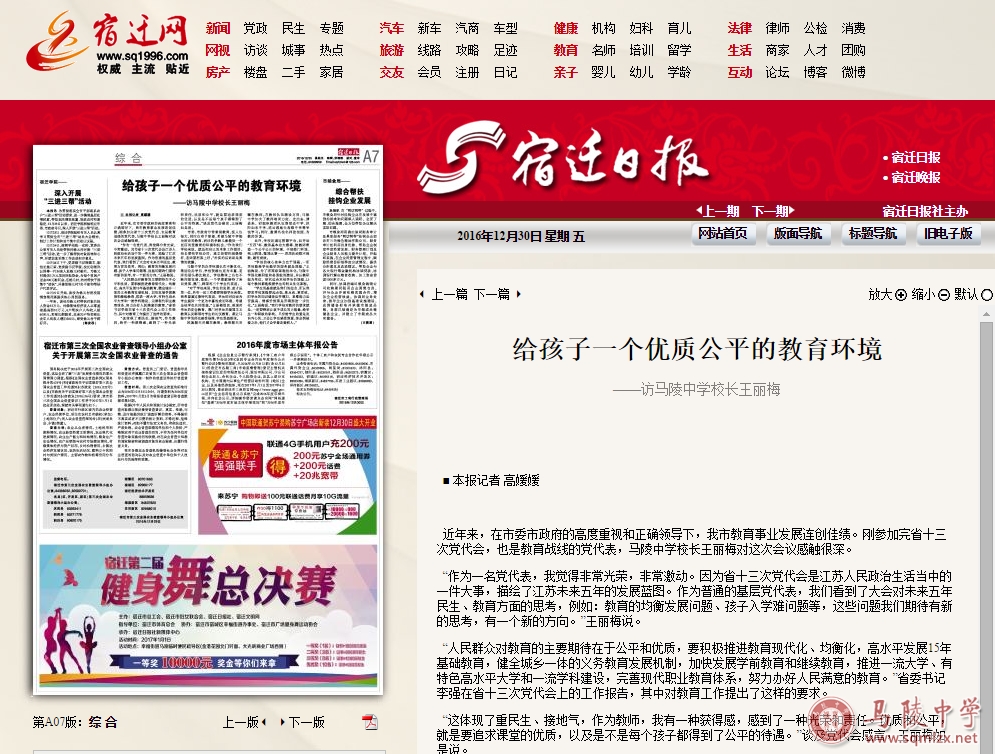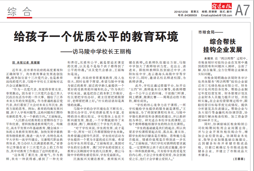 市委、市政府非常重视教育,投入也很大,同时也寄予厚望,希望马陵中学能为宿迁的教育、宿迁的学龄儿童提供一个更好的受教育的环境和机会。“作为我们学校来说,就是把自己的本职工作做好,校长要把学校办好,班主任要把班级管好,老师要把课上好。”朴实的话语却是真情的流露。