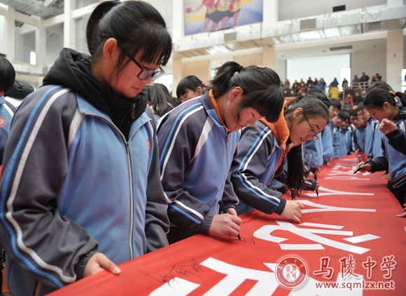 最后,高二年级全体同学共同宣誓,将大会推向了最高潮。同学们分班级在本班的冲刺小高考口号横幅上签上自己的名字,进一步表达对小高考必胜的信心。