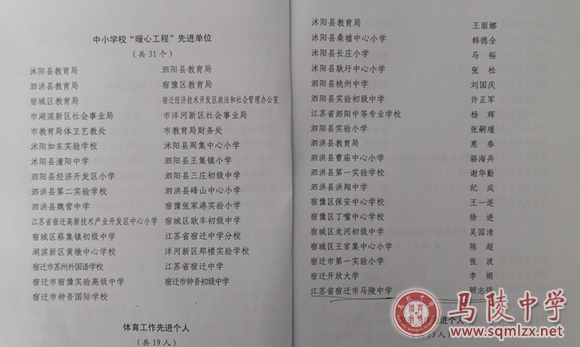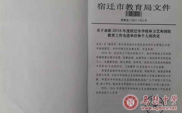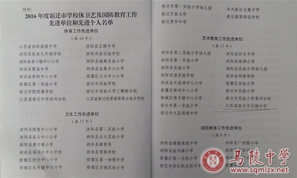 在2016年度宿迁市学校体卫艺及国防教育工作先进单位和先进个人评比中,我校被评为艺术教育工作先进单位,顾志强老师被评为体育工作先进个人。