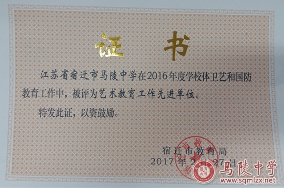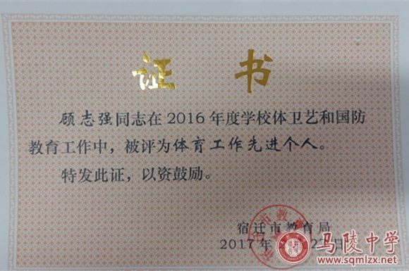 在2016年度宿迁市学校体卫艺和国防教育工作中,我校被评为艺术教育工作先进单位,顾志强老师被评为体育工作先进个人。