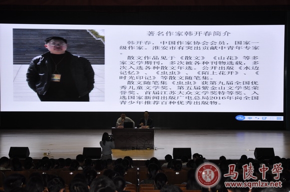 4月24日下午,我校邀请中国作家协会会员,中国散文学会会员,文学创作二级,淮安市有突出贡献中青年专家韩开春举办了一场“阅读与写作”讲座。会议由副校长杨忠平主持,高一、高二年级学生及全体语文教师参加了会议。