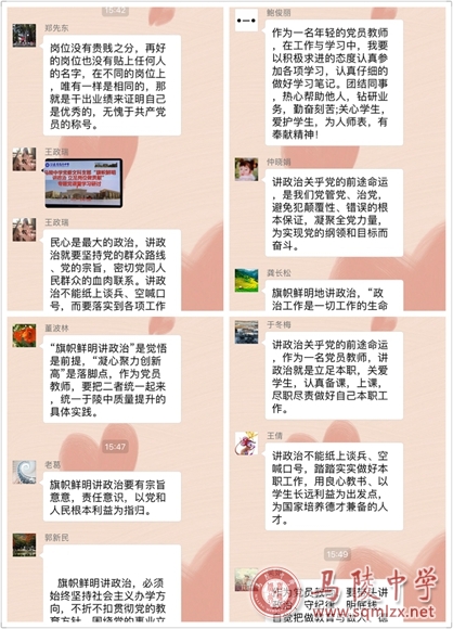文科、理科、后勤支部书记分别开设“旗帜鲜明讲政治,立足岗位作奉献”党课之后。各支部以代表发言与党小组内交流的形式,组织了每位党员同志畅谈感受,交流思想,并将发言摘要内容及时发布在支部微信群。