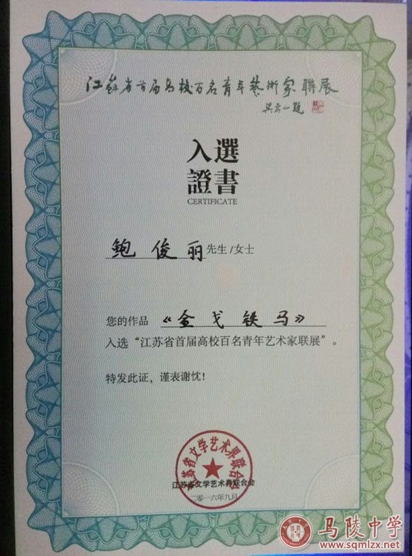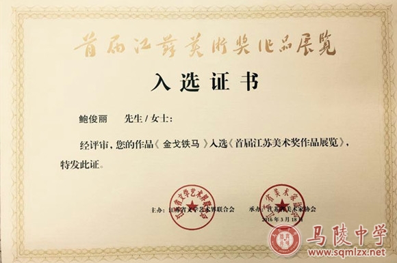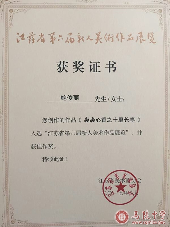 我校鲍俊丽老师创作的作品《袅袅心香之十里长亭》入选“江苏省第六届新人美术作品展览”,并获佳作奖。另一部作品《金戈铁马》入选《首届江苏美术奖作品展览》。