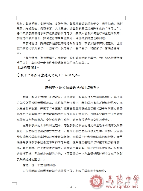 今后的英语课堂教学应在以下三方面有得力举措:一是突破词汇关,二是突破阅读关,三是吸引学生对英语学习的兴趣,引导学生主动参与,积极配合,乐于进取,把英语学好,才能对英语学习保持一股持之以恒的热情与动力。同时还要指导学生选择正确的英语学习策略、学习方法、应试技巧。大胆放手,多给学生自主学生时间,增加阅读时间和内容,泛读和精读相结合,争取用一年时间探索出一条符合马陵学情英语学习的有效路径! (高二2部主任 朱 卫)