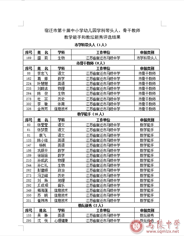 近日,从宿迁市教育局公布的“宿迁市第十届中小学幼儿园学科带头人、骨干教师、教学能手、教坛新秀评比结果”中获悉,我校盛莉老师获宿迁市第十届学科带头人称号,李忠飞、葛婷、叶慧慧、刘晓洁、陈俊、杜宗、李敏、金伟芳等8位教师获骨干教师称号,张莹莹等16位教师获教学能手称号,吴静、沈悦两位老师获教坛新秀称号。