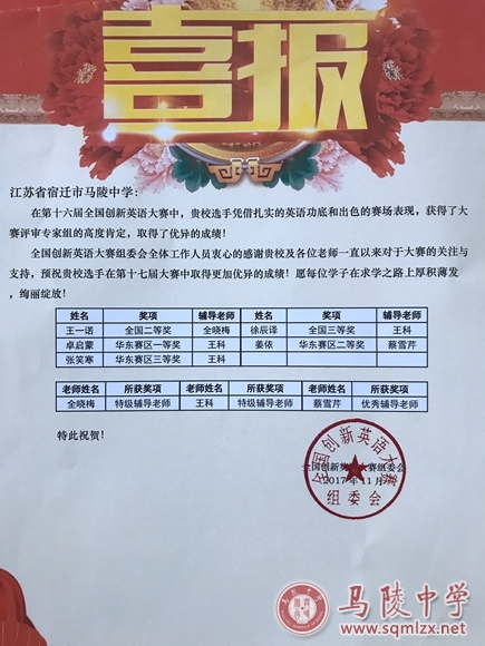 为提高学生学习英语的兴趣,培养学生的英语交际能力和阅读能力,我校英语教师在平时的教学中注意发挥自己的特长,开设并指导学生开展各种英语演讲、课本剧表演等活动,辅导学生参加英语竞赛,多次获得全国、省级奖项。我校参加全国创新英语大赛的宗旨是:推进素质教育,培养创新人才,与高校探索多元选拔优秀人才机制(自主招生)接轨,让在英语方面学有专长的学生更加全面地展示自己。