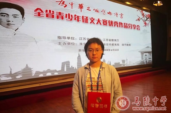 我校在本次大赛中获三项殊荣:高三(2)班潘彦君获得中学组一等奖,学校获优秀组织奖,戚品红老师获优秀指导老师奖。潘彦君撰写的《接过爷爷的火把》深得切口要小、挖掘要深、用情要真的作文要旨,从爷爷的收音机写起,把爷爷年轻时扛起刀枪英勇战斗的光辉岁月与年老时因为不识字而唏嘘嗟叹形成对比,把爷爷一辈子不识字的遗憾写得非常动情,文章表达了作者接过爷爷手中激情燃烧的火把,努力读书、学习知识用知识之火燃烧我的国的坚定信念。整篇文章虽然没有直接点明“中华之崛起而读书”的主题,但是用切身的体会和缅怀周总理的简短语言,表达了作者在继承老一辈革命精神的基础上,为了祖国的未来发奋学习的强烈愿望。