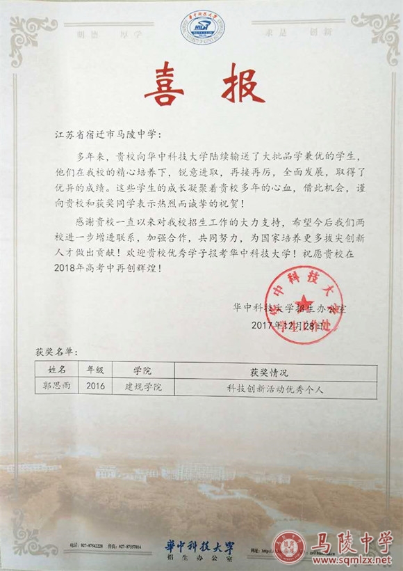 2018年新年伊始,我校接收到华中科技大学喜报:我校2016届毕业生郭思雨同学荣获华中科技大学“科技创新活动优秀个人”荣誉称号!