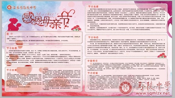 “谁言寸草心,报得三春晖”。每年五月第二个星期日的母亲节已经成为一个公众必过的节日。今年我校以母亲节为契机,通过主题班会、展板宣传等形式深化感恩教育,鼓励学生们在这一天,真诚大方地向妈妈表达感激与爱意。