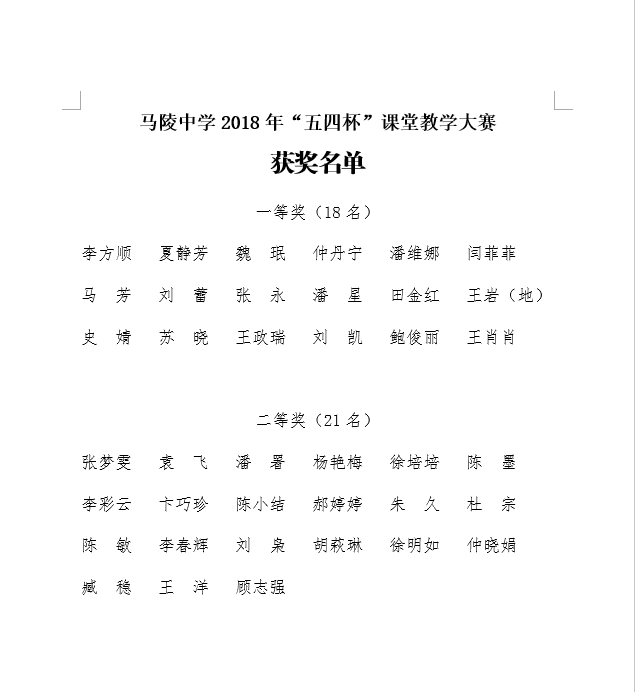 马陵中学2018年“五四杯”课堂教学大赛获奖名单