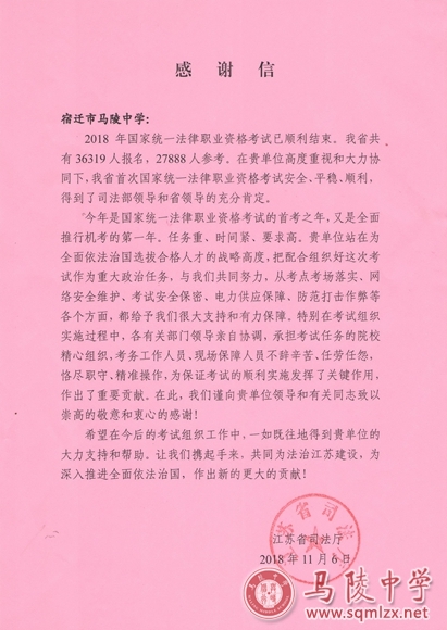近日,我校收到来自江苏省司法厅的感谢信,信中对我校积极配合省司法厅做好2018年国家统一法律职业资格考试宿迁考区考务工作予以充分肯定。