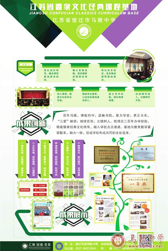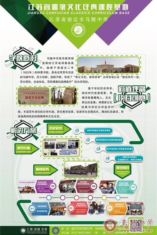 我校源于1882年清道光二年的钟吾书院,百年马陵,博收约守;滥觞书院,复为学堂;养正为先,“三爱”继倡;接续宏旨,立德树人。学校梳理近两百年办学经验,吸收儒家经典文化精华,融汇时代先进文化,顺应时代发展需要,用儒学智慧熏陶人,关注师生发展。2015年5月学校成功申报“江苏省儒家文化经典课程基地”。回眸历史,追本溯源,尊崇传统,弘扬儒学,涵养心性,培植道德,此为基地建设之要义所在。