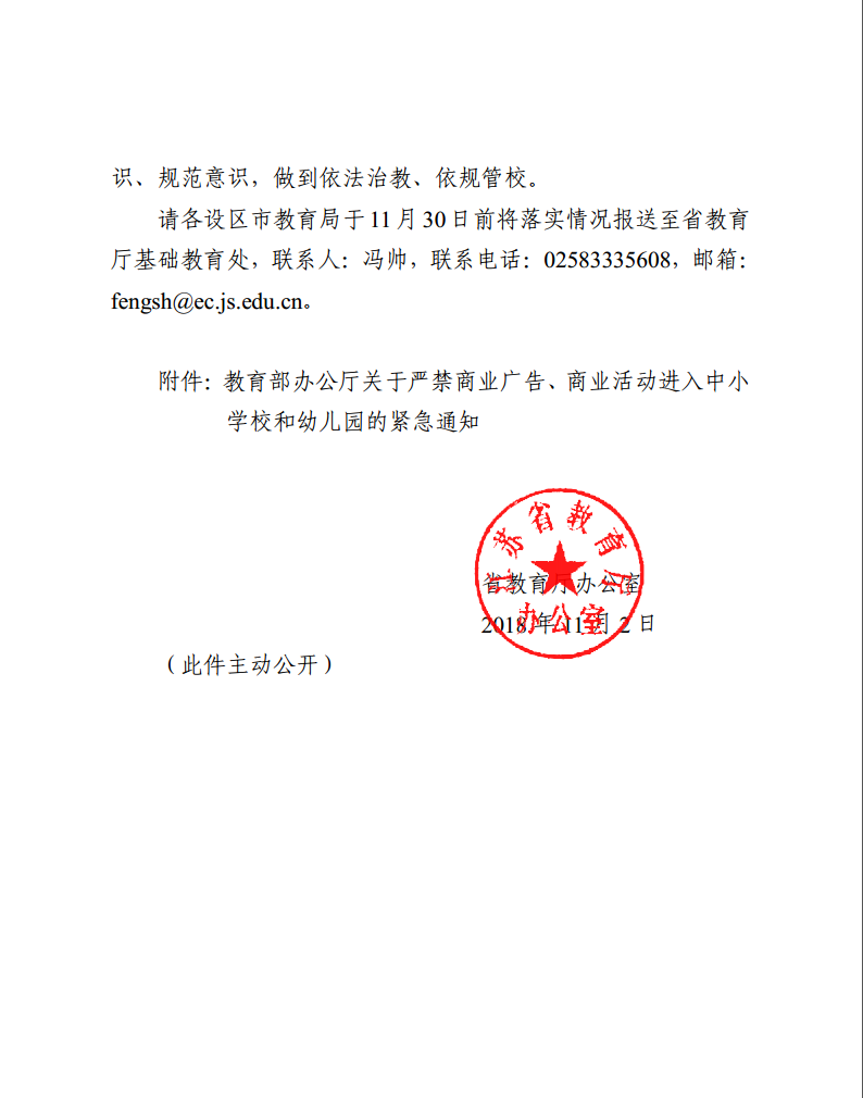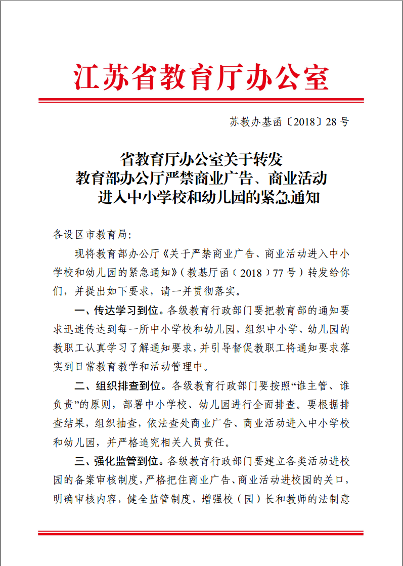 现将《省教育厅办公室关于转发教育部办公厅严禁商业广告、商业活动进入中小学校和幼儿园的紧急通知》(苏教办基函〔2018〕28 号)转发给你们,并提出如下要求,请一并贯彻落实。