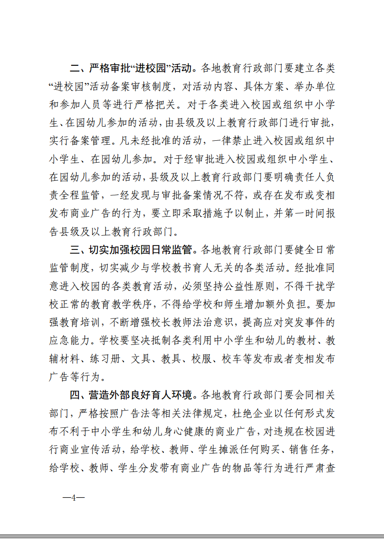 一、高度重视。各县(区)教育主管部门及市直学校要高度重视此项工作,坚决杜绝商业广告、商业活动进入中小学校。要建立各类“进校园”活动备案审核制度,对活动内容、具体方案、举办单位和参加人员等进行严格把关。全市各中小学(幼儿园)要认真学习领会教育部、省市文件精神,做到依法治教、依规管校。