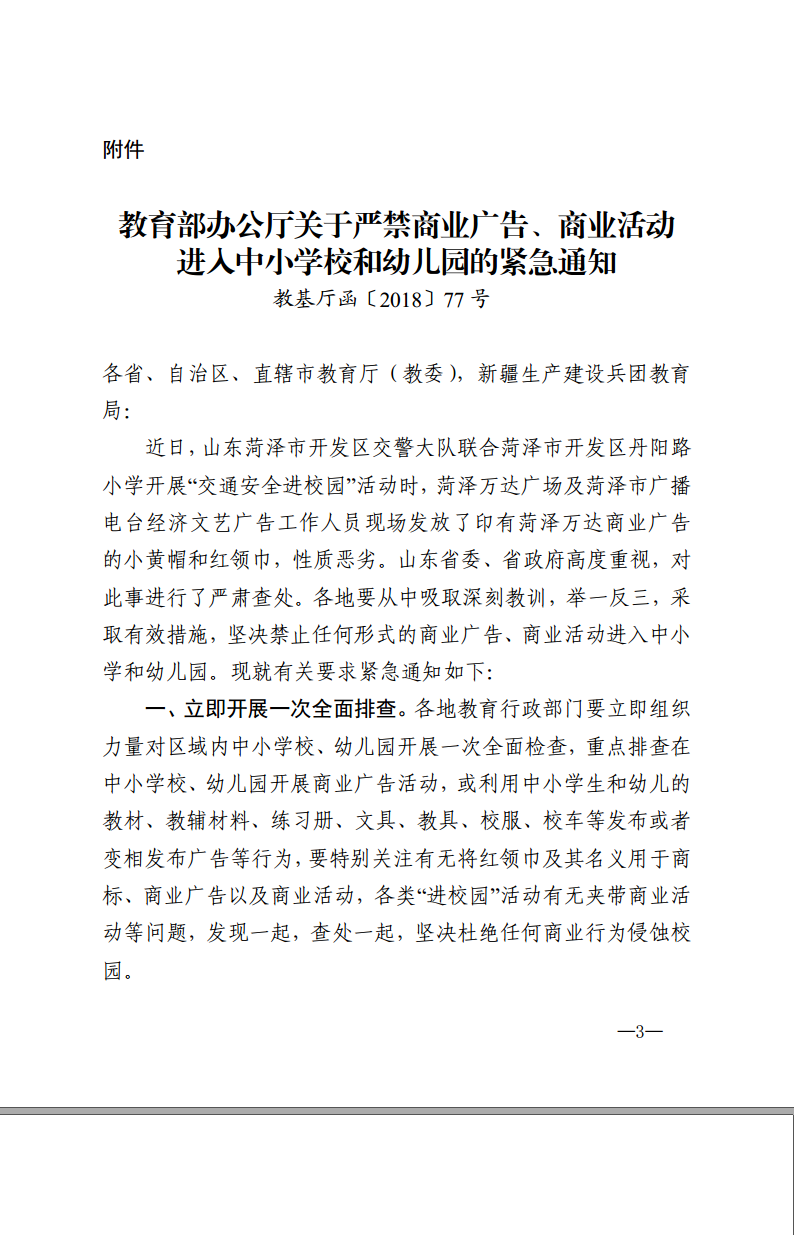 附件:省教育厅办公室关于转发教育部办公厅严禁商业广告、商业活动进入中小学校和幼儿园的紧急通知
