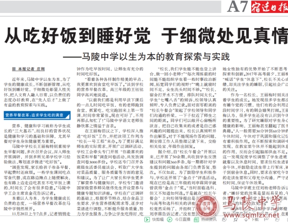 近年来,马陵中学以生为本,为了学生的健康成长,不断创新管理,从吃好饭到睡好觉,于细微处彰显人性关怀,把人文育人融入日常,以负责任的态度办好教育,在“先人后才”上做了有益的教育探索与实践。