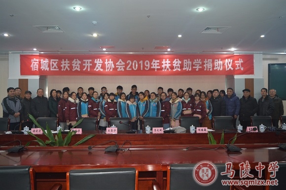 1月11日下午,宿城区扶贫协会王昌华、李文斌、程继巍三位领导带领多名宿城区爱心企业家在百忙之中来到我校,举行2019年宿城区扶贫开发协会对我校贫困生的助学捐助仪式。我校党委书记张美华、副校长褚俊清、关工委刘秉晨老师等参加此次仪式。