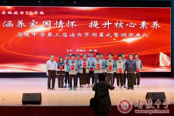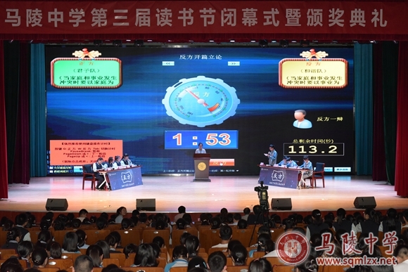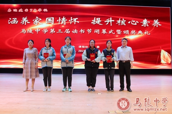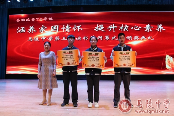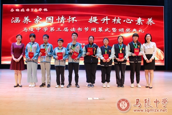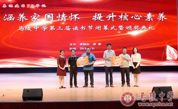 闭幕式上还为本届读书节各项活动的一等奖获得者颁奖,为辩论赛冠亚军及最佳辩手颁奖,并为高一、高二年级处及高一、高二的语文、英语备课组颁发了优秀组织奖。